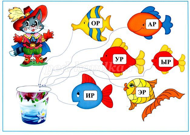 Кіт запрошує нас на риболовлю. Рибки в ставку непрості, на них написані склади. Прочитайте склад, виловите рибку, і покладіть її у відро. Від рибок малюйте стрілочку до відра.