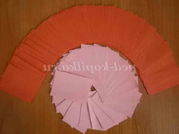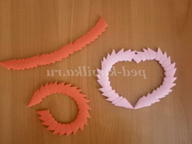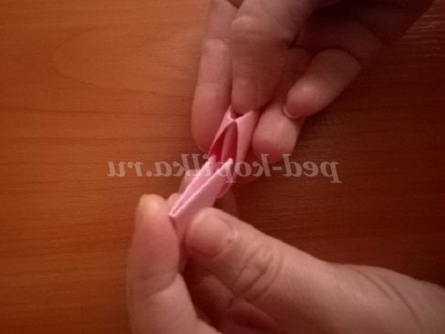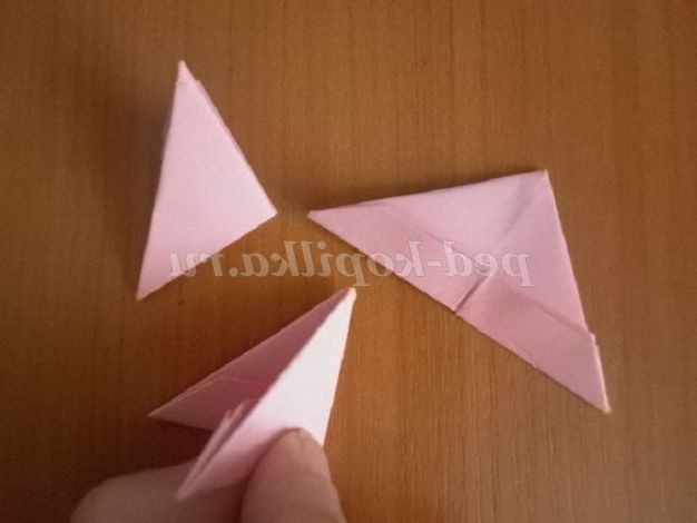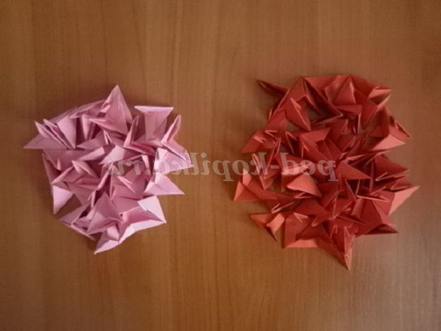 9. Отримані модулі з'єднуємо один з одним. На зовнішніх сторонах модулів є « кишеньки». Ось у ці кишеньки і вставляємо наступний модуль. Виходить 2 заготовки рожевого кольору (кожна заготовка складається з 24 модулів) і 2 заготовки червоного кольору ( 1 заготівля зроблена з 18 модулів)