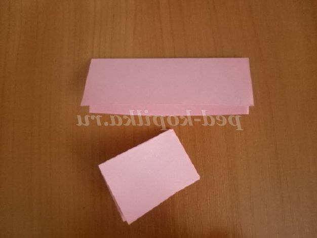 4. Далі робимо з прямокутників трикутні модулі. Для цього беремо заготовку і згинаємо навпіл по довжині. Потім згинаємо папір, поєднавши короткі сторони, щоб намітити на середину заготівлі модуля.