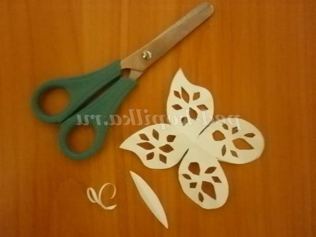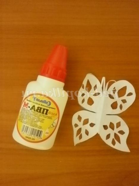 19. 20. 21.Чтобы зробити метелика, спочатку половинку потрібно намалювати на складеної навпіл папері білого кольору, а потім вирізати. Візерунки на крильцях вирізаємо як візерунки на сніжинки! Приклеюємо деталі: тулуб, вусики і метелик готова!