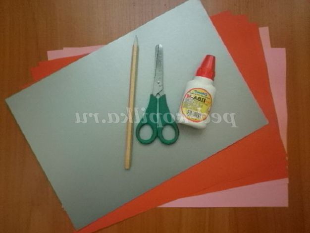 Для цього нам знадобляться наступні матеріали: картон, клей ПВА, простий олівець, кольоровий папір для принтера: 2 червоних листа, 3 рожевих і 1 білий; ножиці.