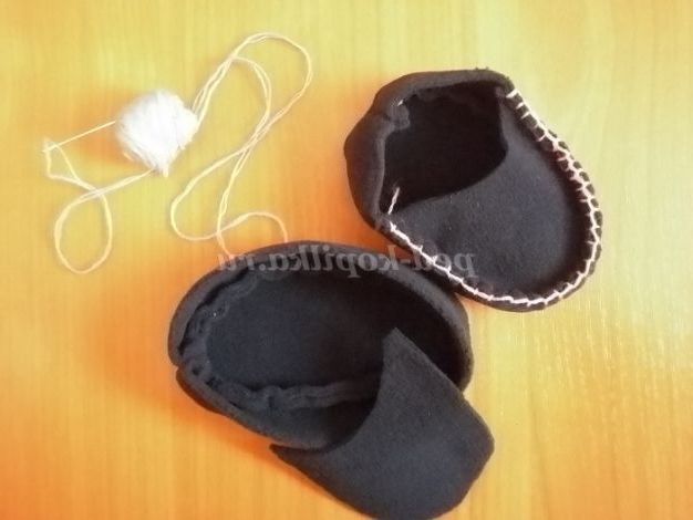 12. До готовим « тапочок» залишилося пришити гумки від шкарпеток! Для цього вивертаємо заготовки пінеток і гумки, пришиваємо їх один до одного!