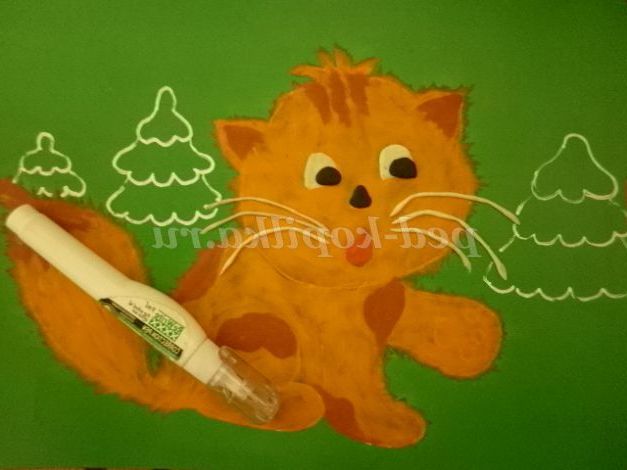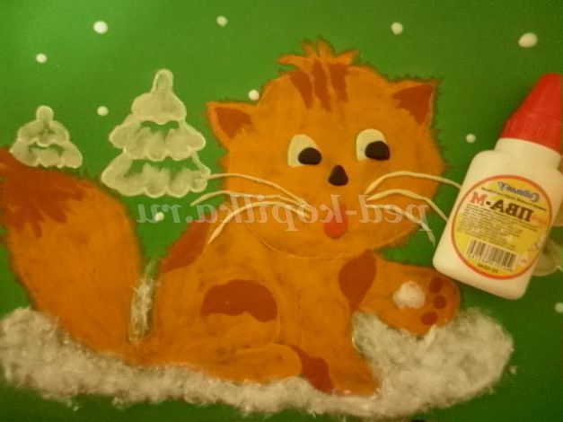 11. Ялинки готові і як по чарівництву на картині почав падати перший білий сніг! Для цього на різних частинах картини наносимо точками клей ПВА і приклеюємо сформовані з вати пухнасті сніжинки. Такий же « пухнастий сніжок» і робимо під котиком. Одна сніжинка впала прямо в лапу " котику і він почав її здивовано роздивлятися!