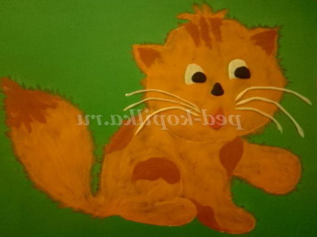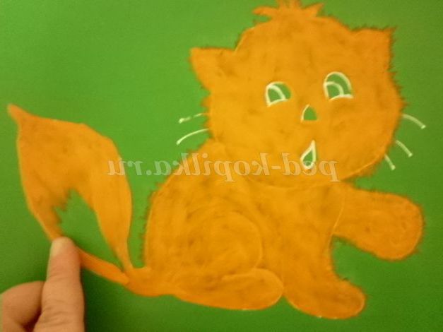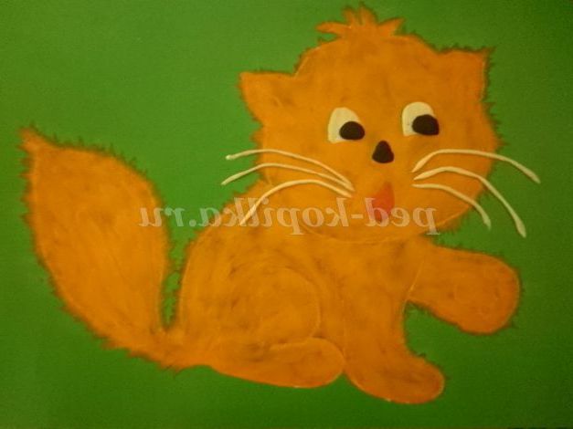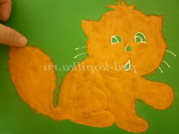 6. Для того, щоб передати пухнасте хутро кота потрібно великим або вказівним пальцем відтягнути пластилін по краях малюнка.