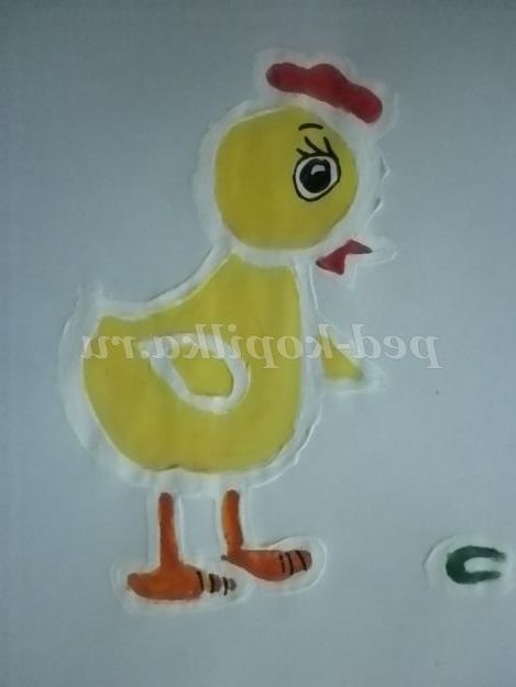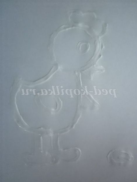 Малюнок майже не видно, але з допомогою фарб ми перетворимо його. Не замальованою залишається тільки контур малюнка засохла зубна паста. Ось хто ховався на білому аркуші паперу - курча!