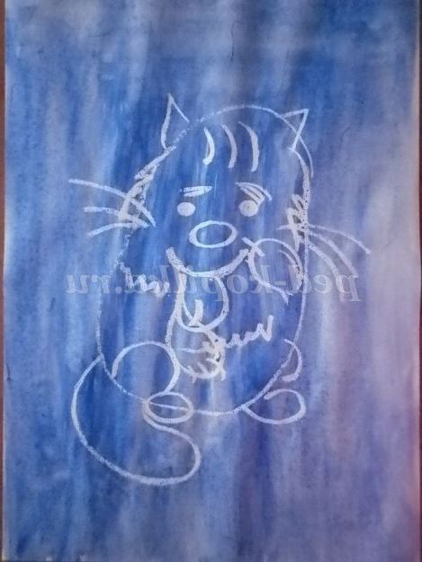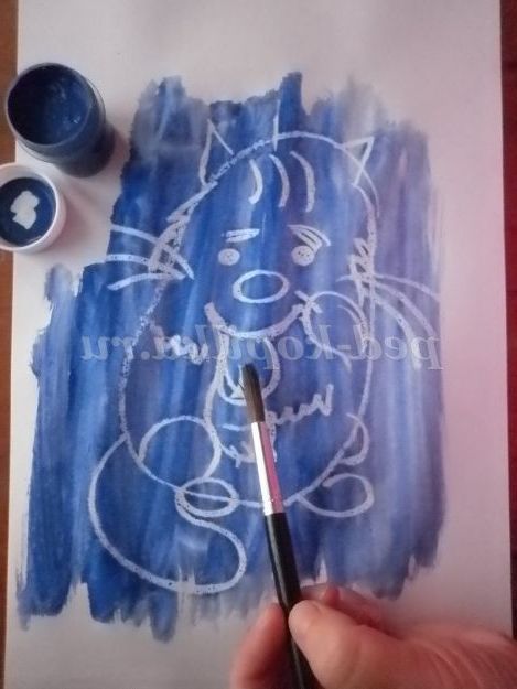 Беремо кисть і гуаш і починаємо замальовувати повністю весь аркуш. Що ж ми бачимо? Диво! Малюнок починає проявлятися!