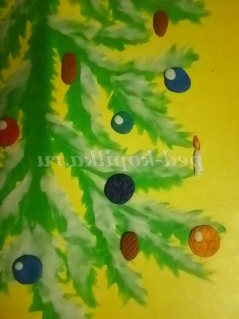 10. Готові кульки розподіляємо на ялинці і придавлюємо до її гілок. На верхівці ялинки «запалимо» яскраву зірку з шматочка червоного пластиліну, розтягуючи його пальчиком у вигляді зірки. Прикрасимо наші іграшки і шишки, наносячи на них різні візерунки за допомогою стеки, стержня ручки або пластиліну.