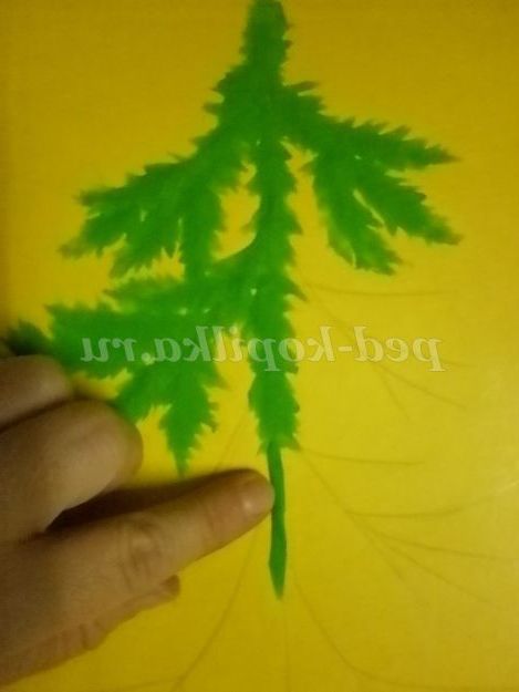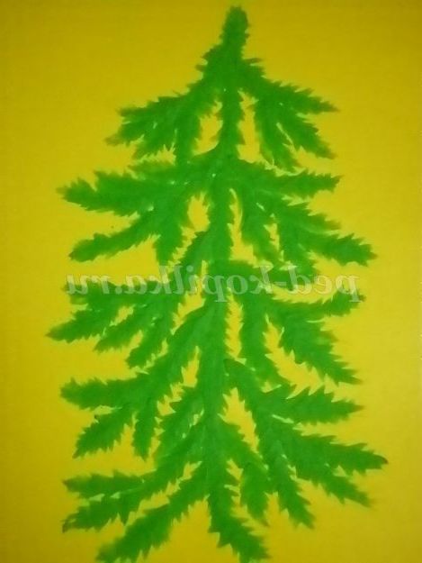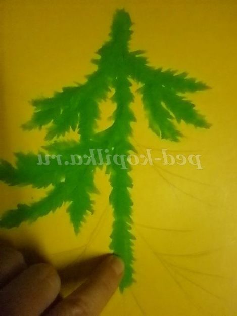 5. Придавлений пластилін примазываем, розтягуємо пальчиком у обидві сторони, таким чином, передаючи пишні голки ялинки.