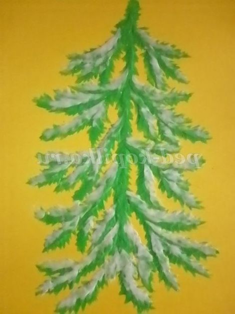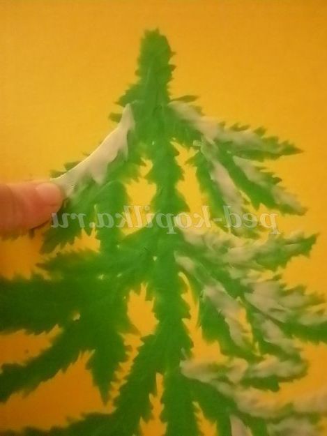 7. Щоб передати білий сніжок на гілках - беремо шматочок білого пластиліну і примазываем його на зелені гілки.