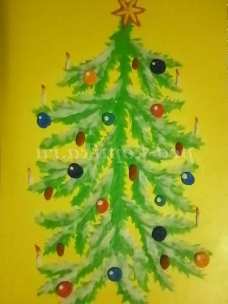 12. Наша новорічна красуня готова! Додаємо напис з пластиліну і покриваємо всю картину лаком для волосся, щоб наша ялинка ще довго радувала нас і нагадувала нам про прекрасне новорічному святі!