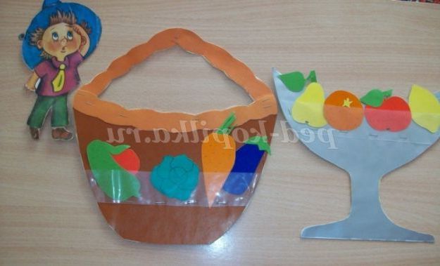 Діти називають і помічають, що Незнайко припустився помилки, овочі і фрукти розклав неправильно. Вони виходять до дошки, пояснюють, що потрібно змінити: «Я з кошика прибираю яблуко і покладу його у вазу, тому що це фрукт».