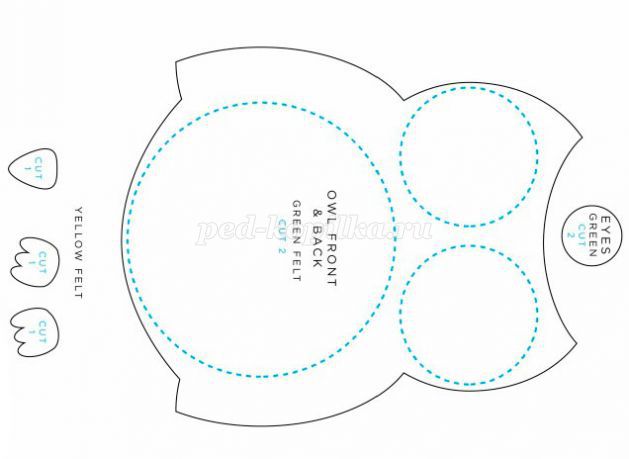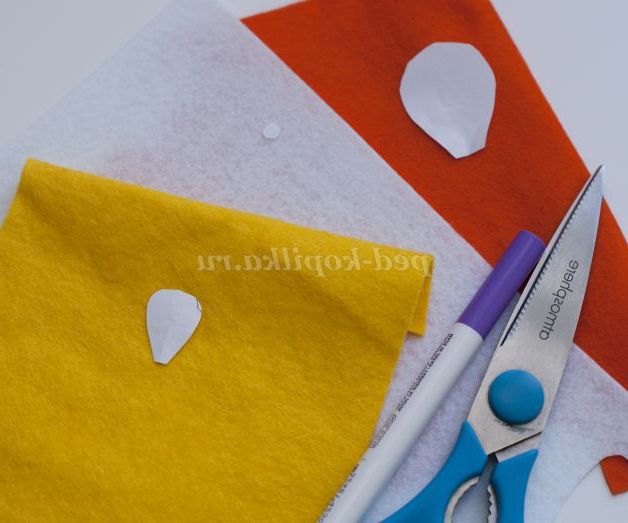 Приступаємо до виконання сови. Вирізаємо деталі за шаблоном сови з різнокольорового фетру.