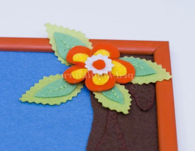 Всі отримані деталі приклеюємо до нашого тлу з блакитного фетру, вирізаного за розміром рамки.