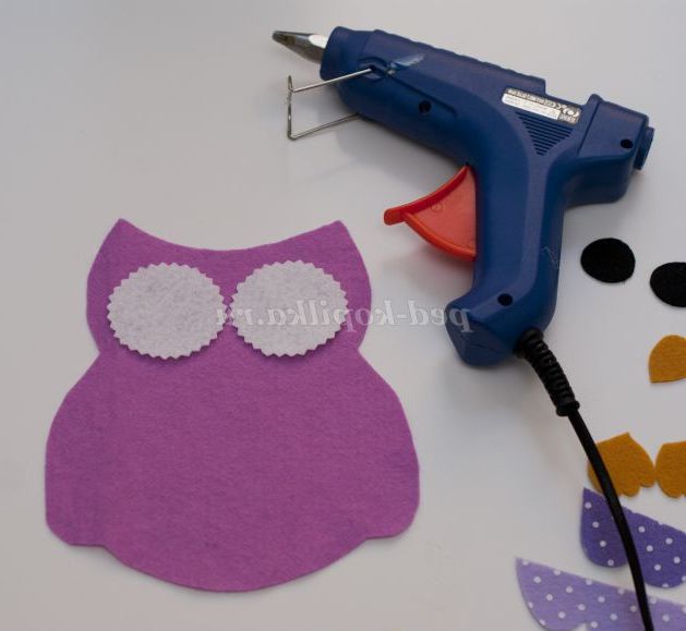 Приклеюємо з допомогою клейового пістолета всі деталі сови, крім крил.