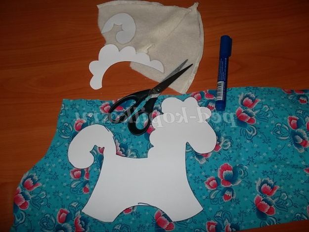 3. За шаблоном вирізати з тканини 2 фігурки конячки і з клаптя тканини іншого кольору вирізати гриву і хвіст