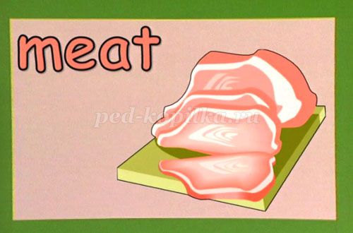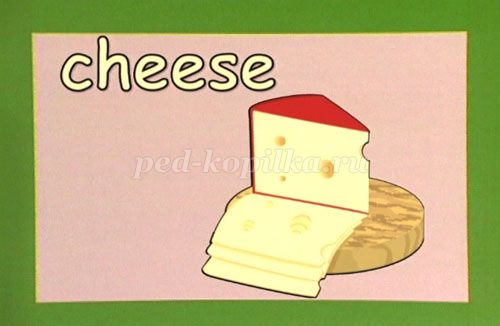 Педагог проходить з коробкою і іграшкою по рядах і діти по-черзі дістають з коробки продукти і називають їх по-англійськи: сир (cheese), молоко (milk), м'ясо(meat), хліб (bread), яблуко (apple), цукерки (sweets)-