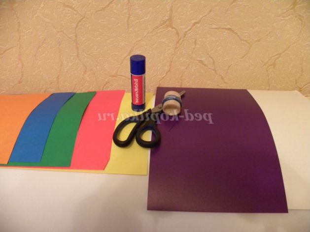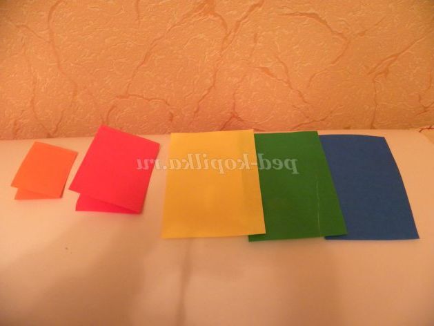 4. Листи кольорового паперу розділити на дві частини, а потім кожну 1/2; частину листа скласти навпіл, потім ще раз навпіл (всього у 4 рази)