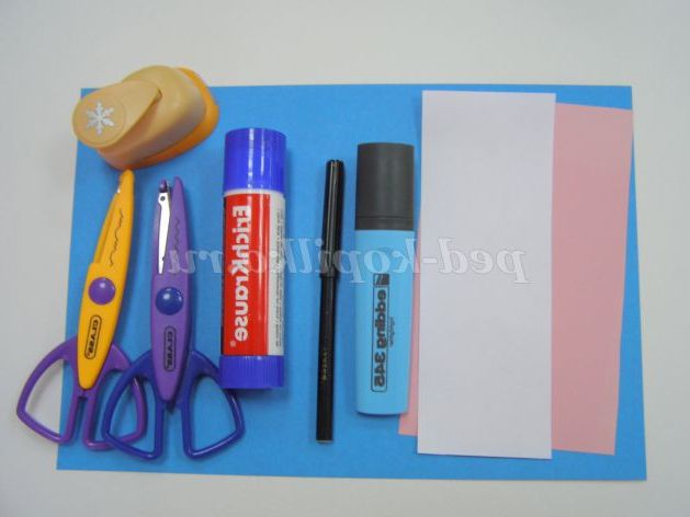 Для роботи нам знадобиться картон синього кольору, папір білого та рожевого кольору, фломастери (або маркери) синього і чорного кольору, клей, ножиці (можна фігурні).