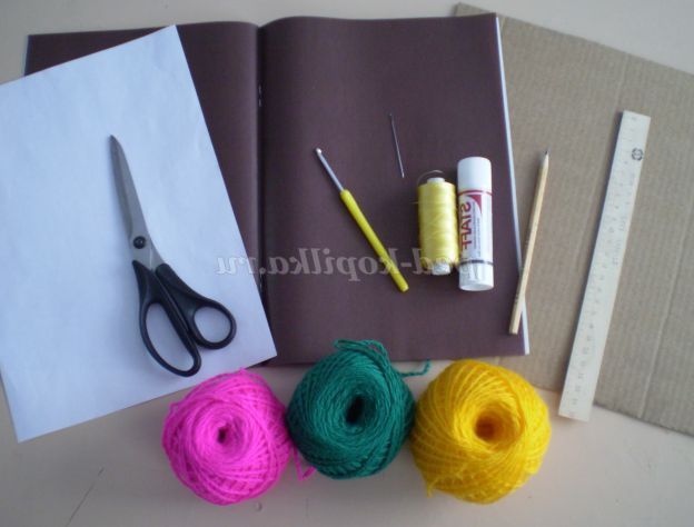 коробковий картон для кошика, кольоровий папір: коричневого кольору і біла, нитки поліестер: червоні, жовті, малинові, зелені, нитки х/б жовті, гачок №3,5 ніж канцелярський, лінійка, простий олівець, ножиці, клей, олівець, голка з великим вушком.