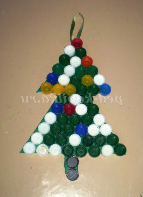 1. На шматку коробкового картону розкладаємо кольорові пластикові кришки у формі ялинки, обводимо простим олівцем. Вирізаємо отриманий контур.