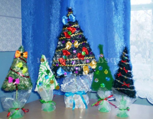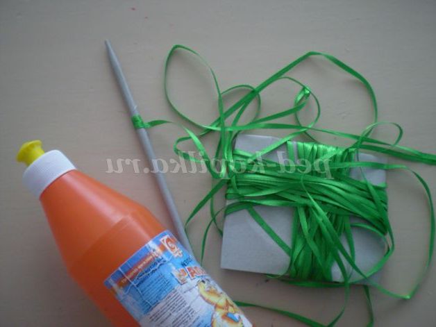5. З широкою атласною тасьми зробіть маленькі бантики і приклейте на ялинку, вставте гострий кінець спиці в отриману ялинку.