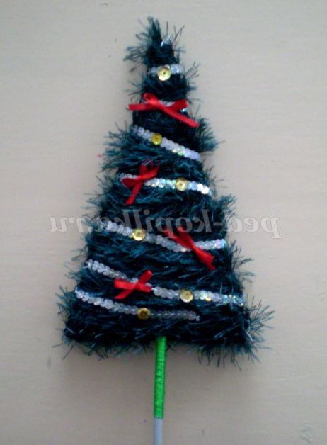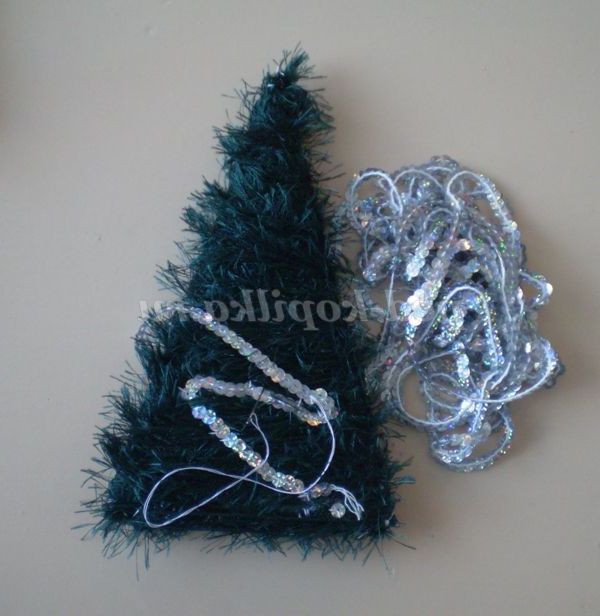7. Вставляємо гострий кінець спиці в трикутник обклеєний тканиною. Прикрашаємо ялинку великими круглими паєтками.