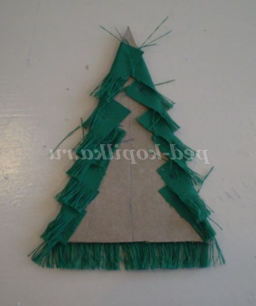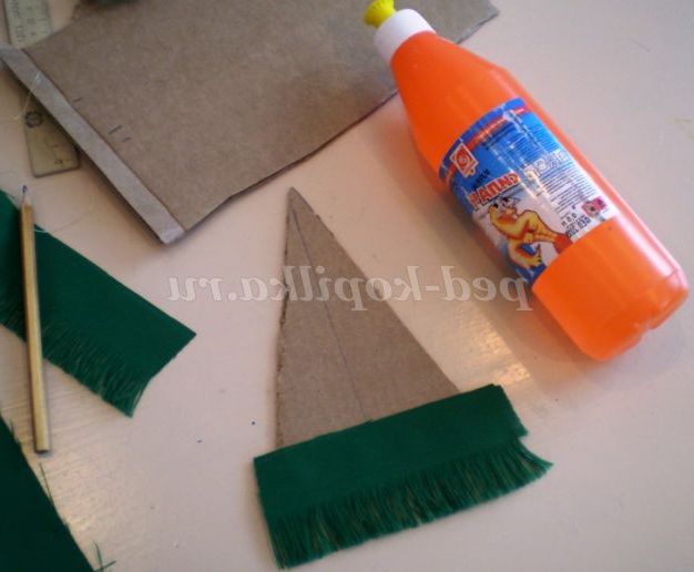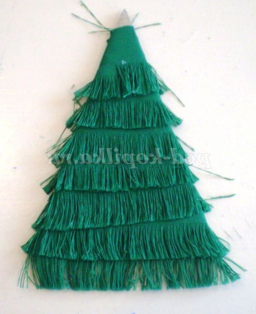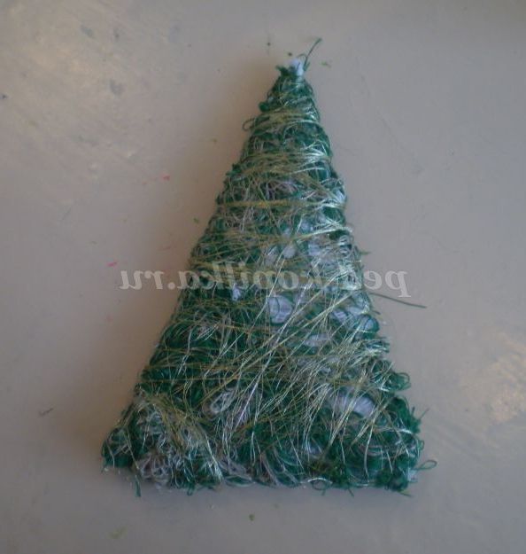 1. Вирізаємо трикутник як для попередньої ялинки, закриваємо зі всіх сторін синтепоном, обмотуємо трикутник білою бавовняною ниткою. Отриману заготівлю обмотуємо нитками «травичка» зеленого кольору.