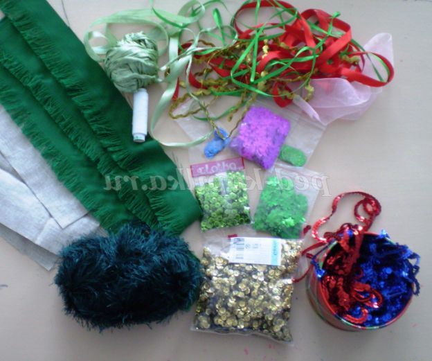Тканина-габардин (зеленого кольору), мішковина, білі нитки х/б, нитки «травичка», паєтки (різного кольору), тасьма різна.