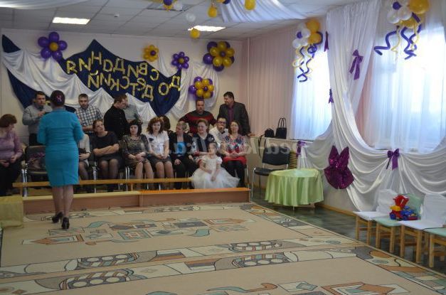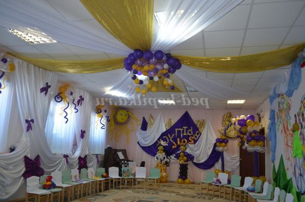 Ось хочу вам розповісти, як ми прикрасили музичний зал на випускний бал у дитячому садку. Сфотографували всіх дітей крупним планом вирізали фотографії для оформлення однієї стіни. Спочатку приклеїли на стіну шпалери білого кольору і намалювали на шпалерах: карету, замок, вихователів і помічника вихователя. Малювали ми восковими та гелієвими мелками.Для блиску додали блиск для волосся і пайетки. Далі приклеїли фотографії выпускников.Платья вихователів про помічника прикрасили тканью.Из зеленої тканини зробили ялинку, прикрасили небо білою про блакитною тканиною. Стеля обтягнули тканинами і прикрасили кульками. Інші стіни ми прикрасили кульками і тканинами. На синю тканину завдали назва свята"До побачення дитячий садок". Трон царя теж прикрасили золотою тканью.Арку теж прикрасили тканиною і поставили біля входу в зал. З повітряних куль зробили дівчинку і хлопчика.