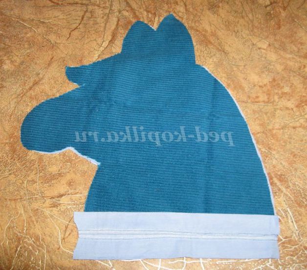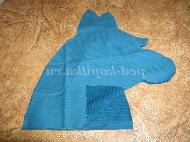 Вибрала наступні матеріали для виготовлення об'ємної шапочки. : вельвет відповідного кольору розміром 50 на 100 см (2014 - рік Синього коня), блакитна тонка тканина для підкладки, трохи синтепону, шматочок темної шкіри для очей.