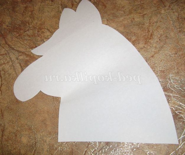Для новорічної вистави знадобилася нам конячка - символ наступаючого 2014 року. Вирішили, що це має бути дитина у відповідній масці або шапочці. Сама я малювати кінську мордочку не вмію, тому знайшла в книзі з казками чудовий кінський профіль. Збільшивши зображення по клітинам, зробила з картону заготовку.
