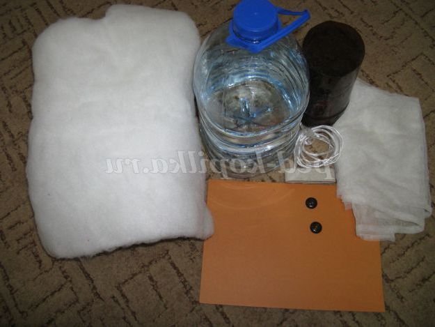 Знайшлося наступне: дві пластикові бутлі 5-літрова ціла і 2-літрова з обрізаною верхньою частиною; шматок синтепону розміром трохи більше 2 метрів; шматок старого тюлю; коричневі ґудзики; шпагат; широка білизняна гумка завдовжки 50 см; помаранчевий і червоний картон.