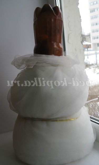 Всю конструкцію для того, щоб матеріал не ковзав по поверхні бутлі, загорнула шаром тюлю, талію позначила мотузкою. Ручка у пляшки піднята вгору, це буде шия.