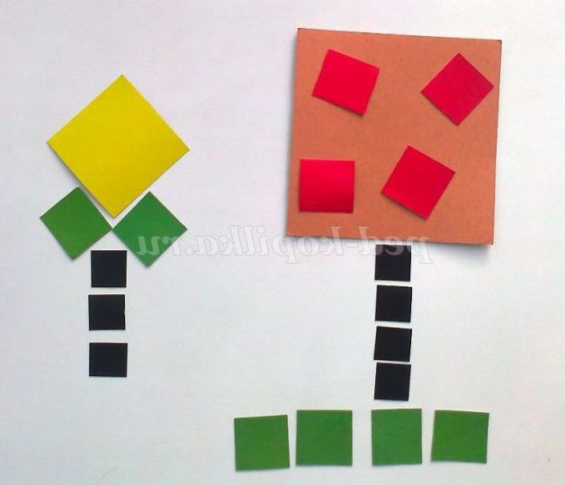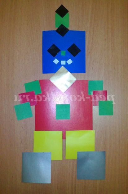 (Діти розглядають зображення, складене з квадратів. Робиться висновок, що ми потрапили в квадратний місто). Так, це незвичайне місто, тут все квадратне. А як звуть нашого нового знайомого? (Діти придумують ім'я «Робот Квадратик»). Пропоную всім надіти чарівні окуляри і подивитися навколо. Якої форми те, що ви бачите? (Діти з наборів фігур викладають зображення чоловічків, рослин, тварин використовуючи тільки квадрати. Роботи розглядаються, кожен розповідає, що вийшло).