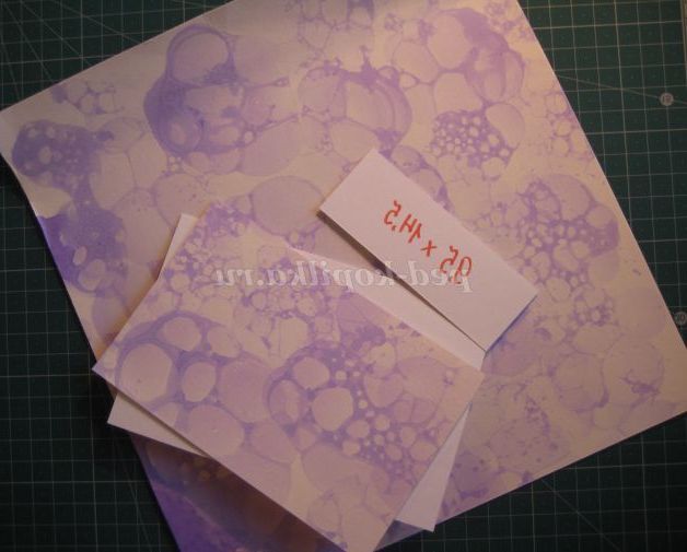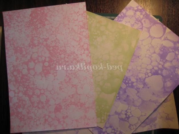 16. Вибираємо основу для листівки. У мене є ось така фарбована папір. Фарбувала я її за допомогою трубочки для коктейлів, рідини для миття посуду і фарб (гуаш, акрилові, чорнило, вообщем, які є в наличии.Разводим рідина для миття посуду з водою і фарбами, опускаємо трубочку і починаємо пускати бульбашки на папір (вони самі будуть витікати з баночки. Папір сушимо і прасуємо праскою, і отримуємо гарні фони для творчості.