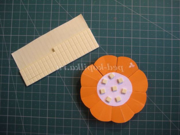 20. Щоб додати об'єм знадобляться подушечки на клейовій основі. Приклеюємо їх до середини квітки із зворотного боку і приклеюємо до підкладці. Будьте обережні! Потрібно відразу рівно і акуратно приклеїти, інакше вже буде важко відірвати, і можна зіпсувати роботу.
