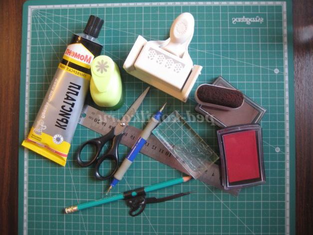 Інструменти: ножиці, циркуль, дироколи, штамп на силіконовій основі, штемпельні подушечки, лінійка, інструмент для біговки.