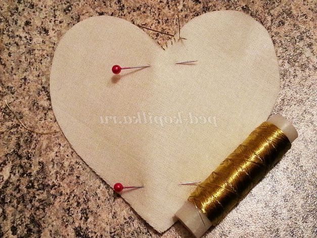 11. Складаємо серця виворотом один до одного. Пришиваємо швом "через край", використовуючи для декору золоту нитку.