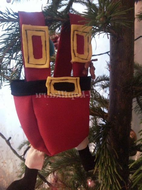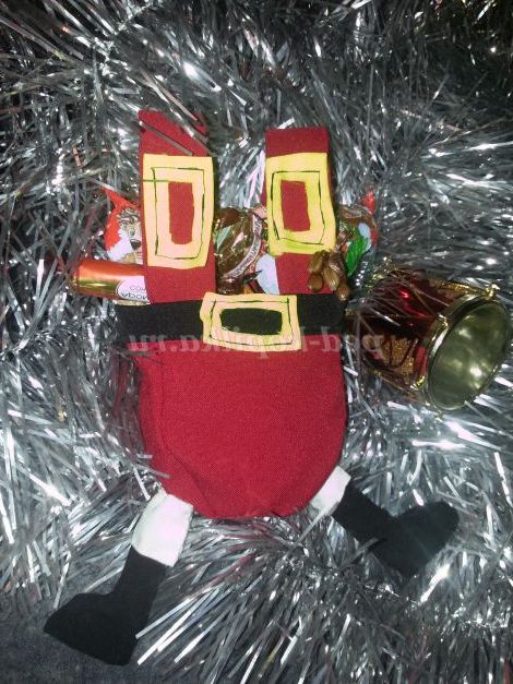 Ось і готово прикраса! У такого Санту можна покласти цукерки або невеликі подаруночки, а якщо зробити його розміром більше, то можна вкласти в нього справжній подарунок. Невеликого Санту за лямки можна повісити на ялинку: