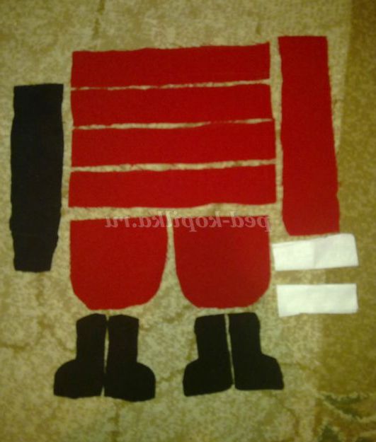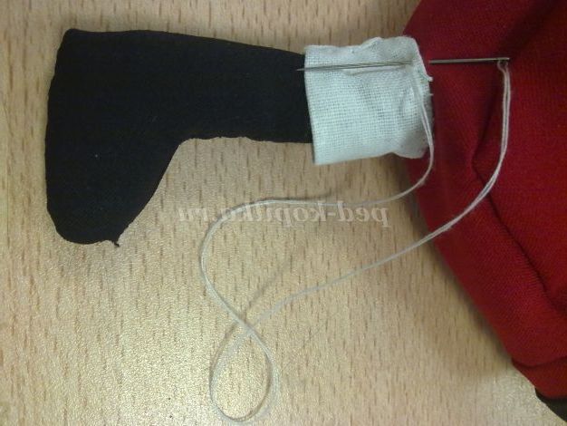 Зшиваємо чорні чоботи. Пришиваємо білу облямівку. Набиваємо ноги, потім пришиваємо до тулуба потайним швом.