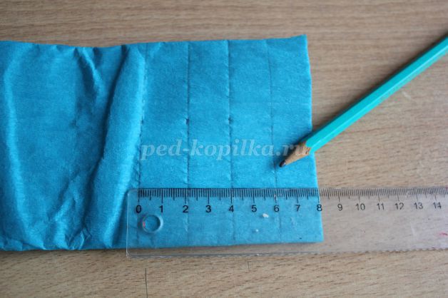 2. Беремо в руку ножиці, на рулоні заздалегідь намічаємо необхідну ширину для квадратиків (2 см) і починаємо вертикально нарізати смужки.
