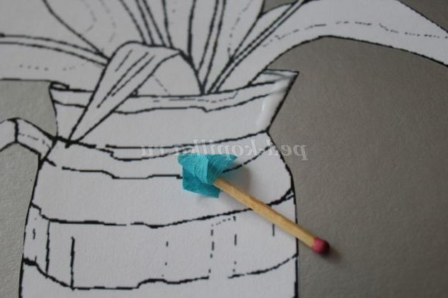 4. Приступаємо до створення композиції. Торцем ставимо сірник на серединку квадратика, потім щільно закручуємо його на сірник. Наливаємо трохи клею ПВА в кришку і маку трубочку-торцювання в клей.