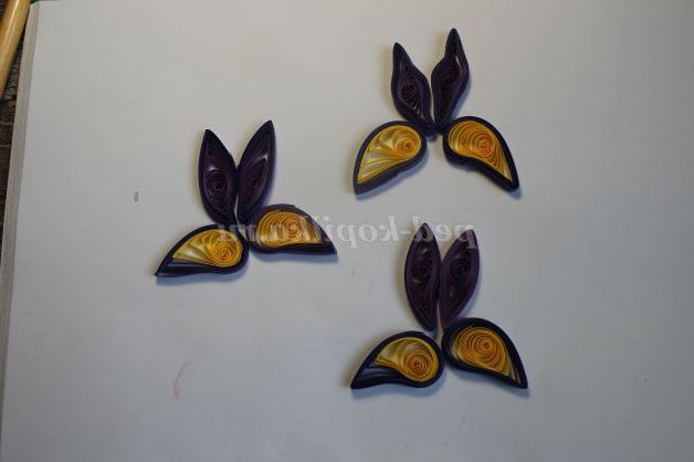 Далі приступаємо до фіолетовим ирисам. Для одного бутона нам знадобиться 4 спіралі, нижнім пелюсткам надаємо форму "Крило".