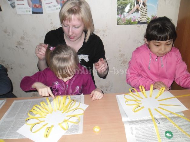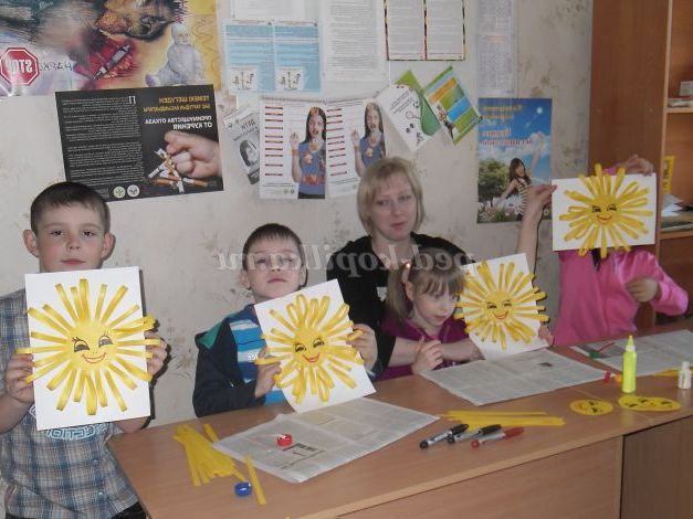 Набір для творчої майстерні (клей ПВА, аркуші білого паперу А4 за кількістю дітей, нарізані смужки з жовтого паперу 1см*20 см в кількості 40 шт на одну листівку, кола з жовтого паперу d8см за кількістю листівок, синій і червоний маркери).
