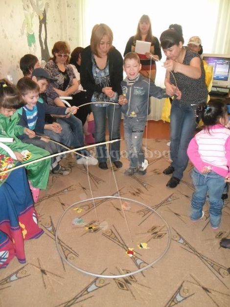 Реквізит: 4 вудки з магнітами замість гачків, набір різнокольорових рибок зі скріпками, обруч.