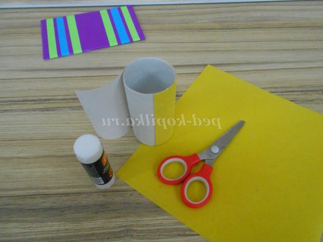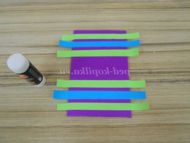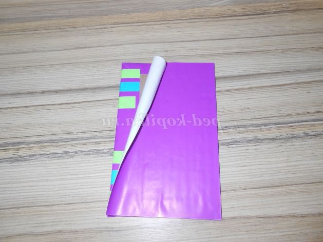 Заправити кінці смуг на виворітну сторону, і обклеїти виворіт кольоровим папером в розмір з картонній заготівлею.