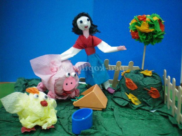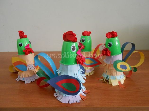 Після кількість деталей зростає, вони різні за формою і фактурою: до переверненого стаканчику кріпимо стаканчик від йогурту, крила і хвіст з паперу,очі, гребінь і дзьоб з грудочок серветок - виходить півник, або доступні дітям маніпуляції з циліндром від паперових рушників перетворюють його на рибу.