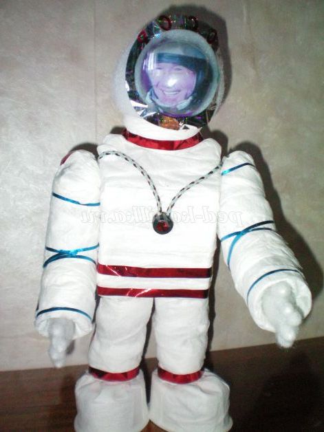 Надалі іграшки і моделі збираємо з кількох однакових або різних за формою і розміром предметів-помічників . Коробки і циліндри, зібрані разом можуть постати в складному образі, наприклад космонавта.