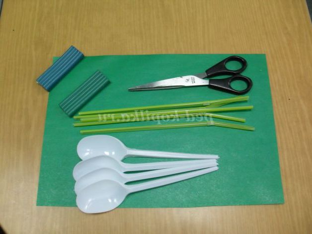 - Трубочки для соку - Одноразові пластикові ложки - Кольоровий папір (зелена) - Пластилін (зелений) - Ножиці