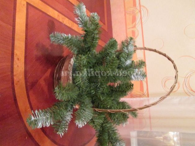 Штучні ялинові гілки акуратно встромляємо в пінопласт, надаючи форму букета (гілки добре гнуться)